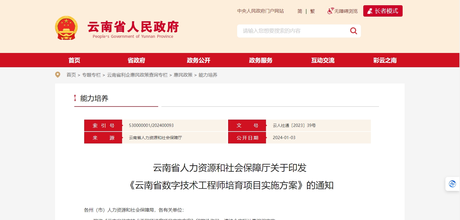 為加快數字云南建設,培養數字技術工程師隊伍,助力數字經濟和實體經濟深度融合。根據《專業技術人才知識更新工程實施方案》(人社部發〔2021〕73號)和《專業技術人才知識更新工程數字技術工程師培育項目實施辦法》(人社廳發〔2021〕71號)有關要求,結合云南省實際,現就實施數字技術工程師培育項目,制定云南省數字技術工程師培育項目實施方案。