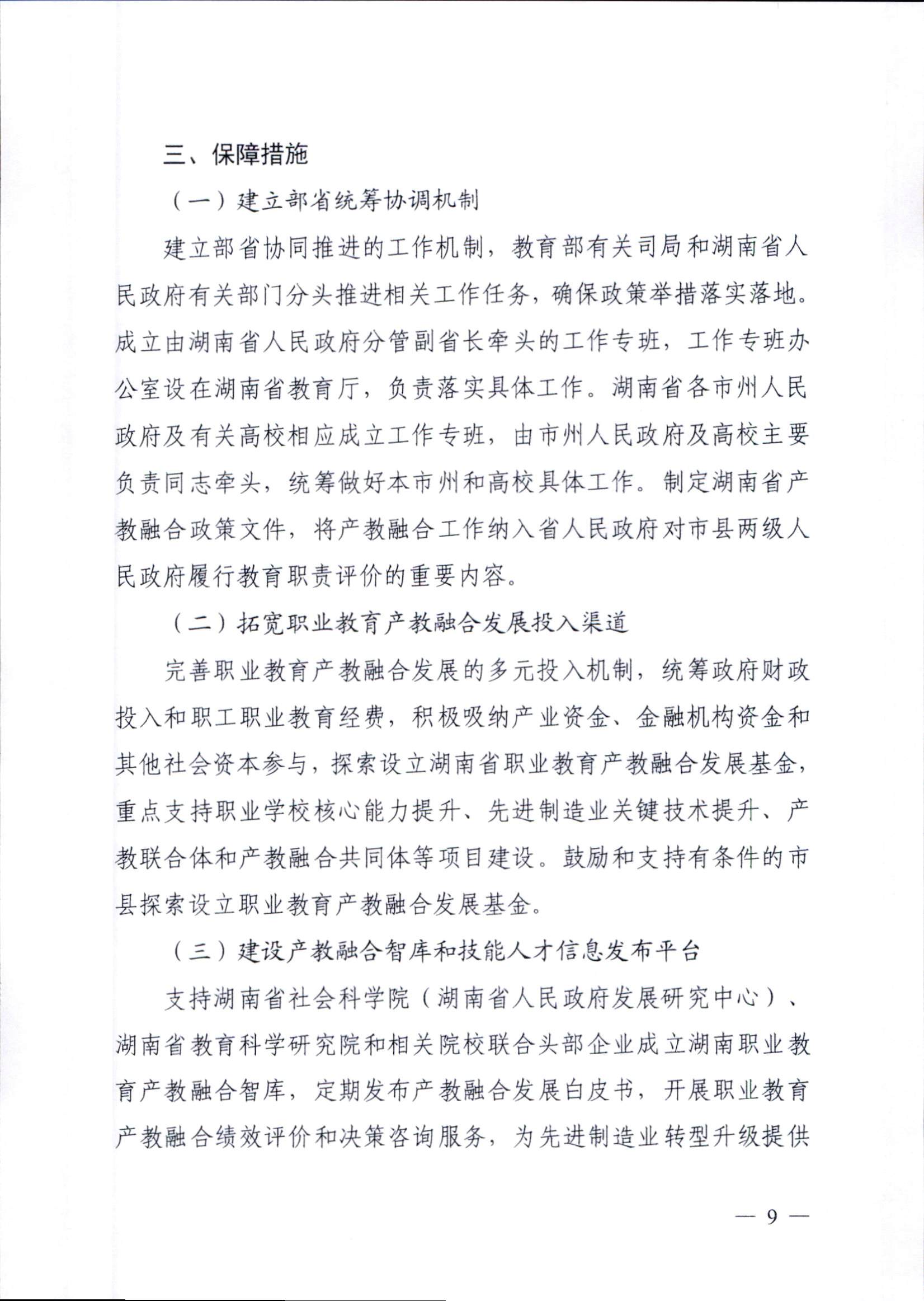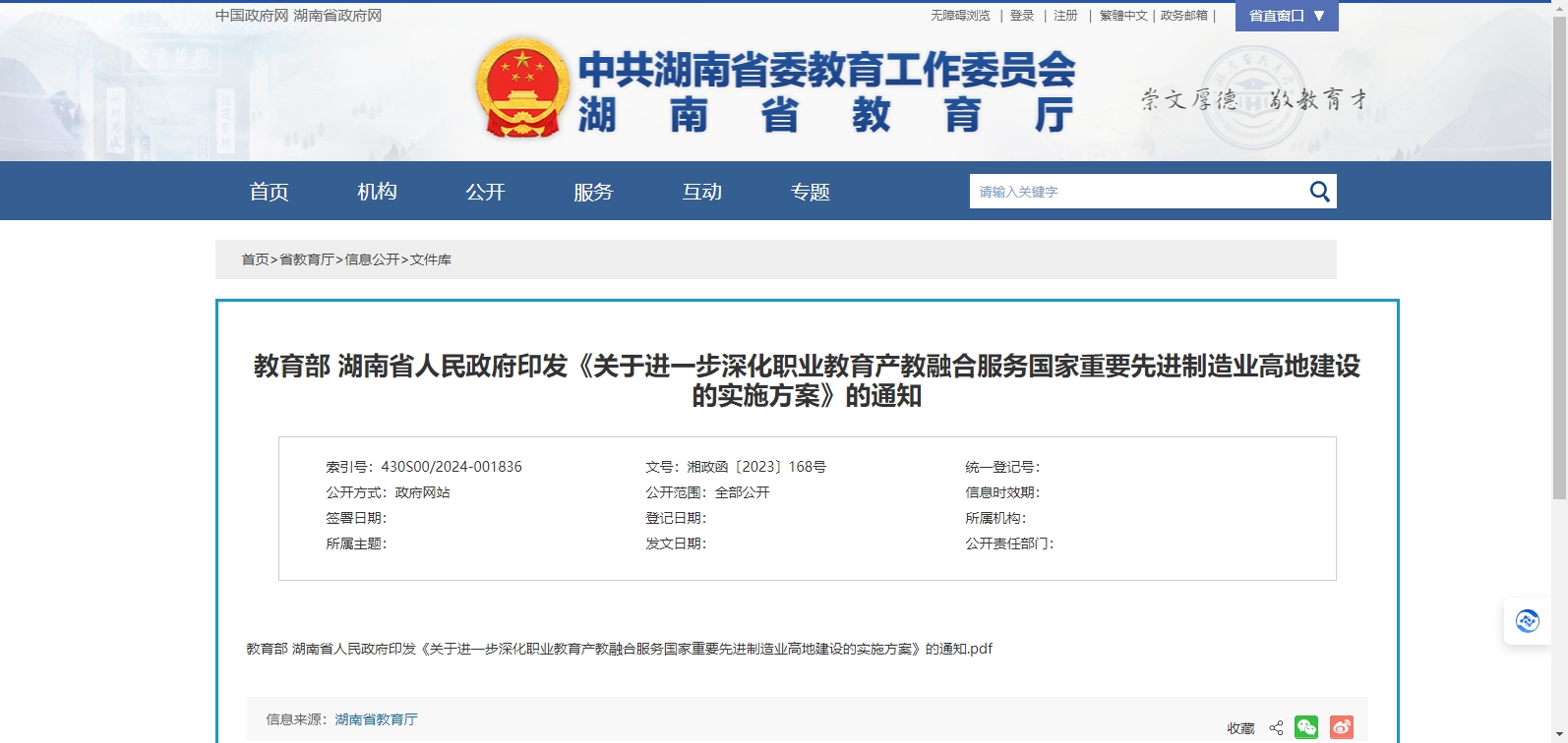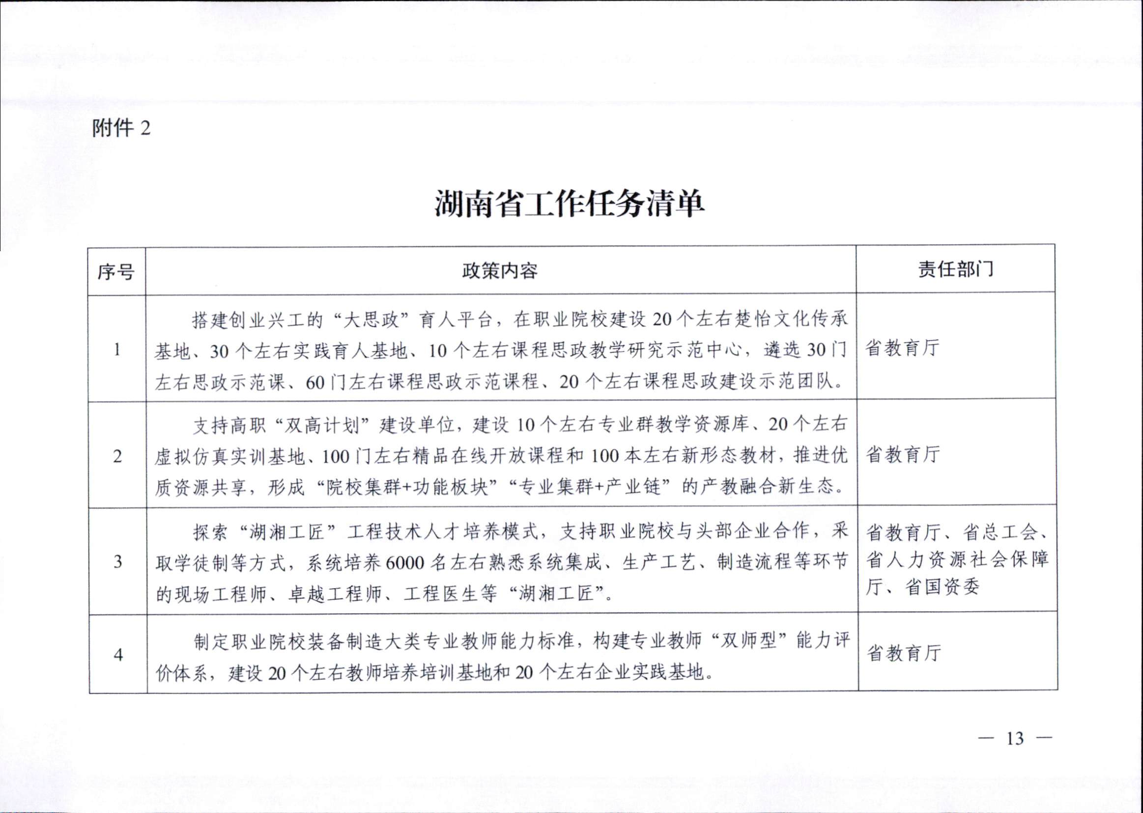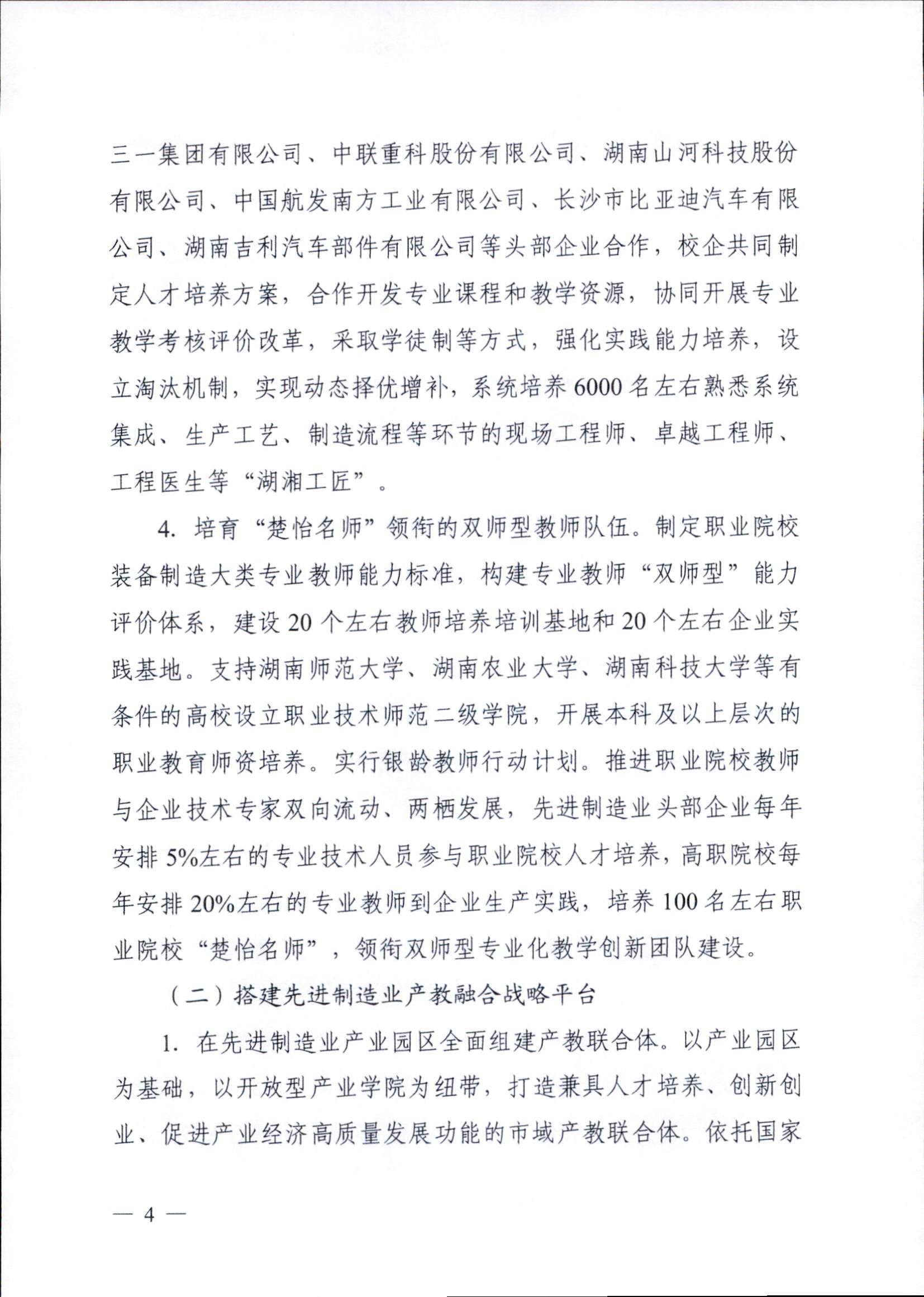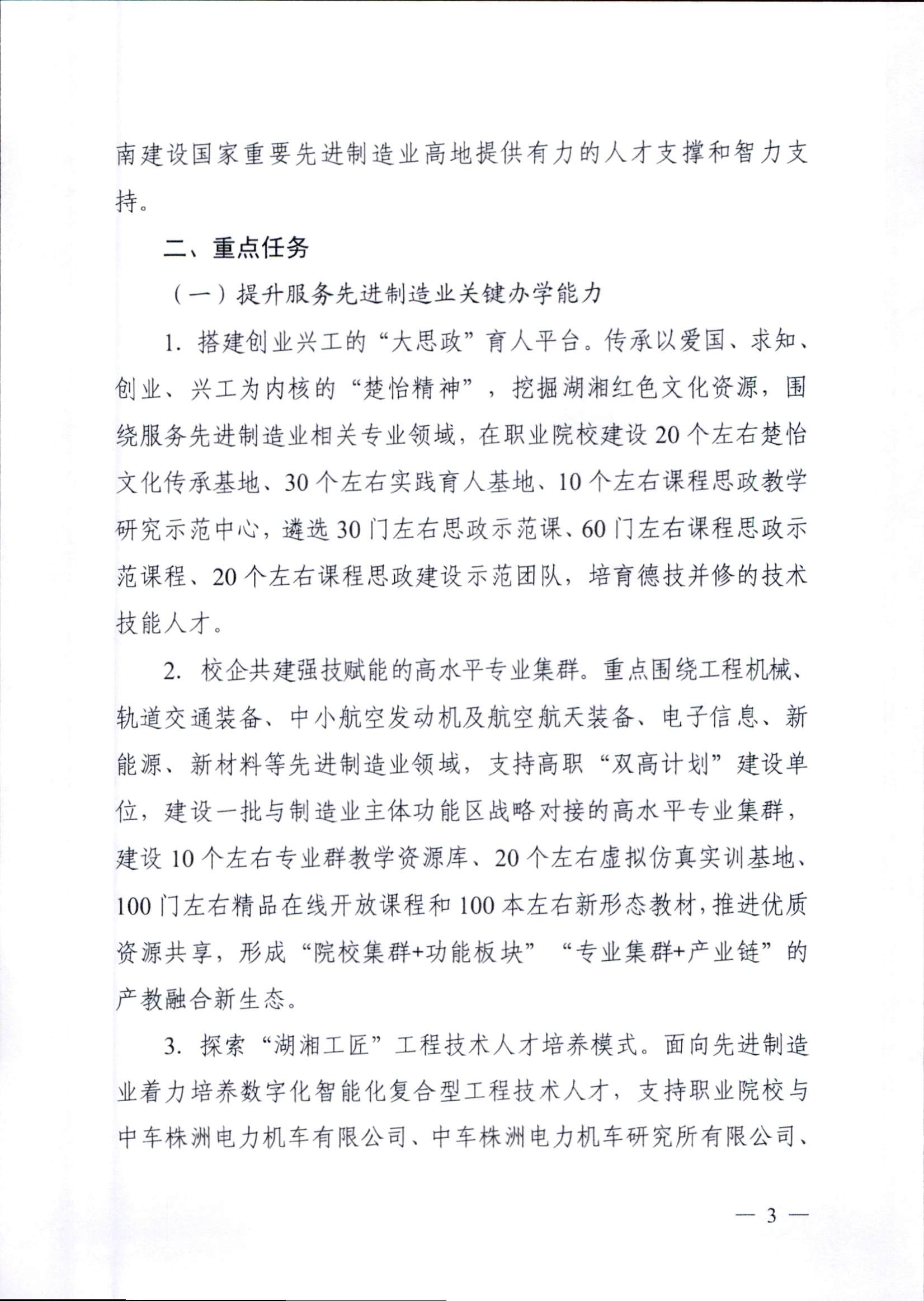 為深入學(xué)習(xí)貫徹黨的二十大精神,落實(shí)《關(guān)于深化現(xiàn)代職業(yè)教育體系建設(shè)改革的意見》,進(jìn)一步深化職業(yè)教育產(chǎn)教融合,助力國家重要先進(jìn)制造業(yè)高地建設(shè),依據(jù)《中華人民共和國職業(yè)教育法》,教育部和湖南省人民政府特制定本實(shí)施方案。其中重要任務(wù)中提及:2.校企共建強(qiáng)技賦能的高水平專業(yè)集群。重點(diǎn)圍繞工程機(jī)械、軌道交通裝備、中小航空發(fā)動(dòng)機(jī)及航空航天裝備、電子信息、新能源、新材料等先進(jìn)制造業(yè)領(lǐng)域,支持高職“雙高計(jì)劃”建設(shè)單位,建設(shè)一批與制造業(yè)主體功能區(qū)戰(zhàn)略對(duì)接的高水平專業(yè)集群,建設(shè)10個(gè)左右專業(yè)群教學(xué)資源庫、20個(gè)左右虛擬仿真實(shí)訓(xùn)基地、100門左右精品在線開放課程和100本左右新形態(tài)教材,推進(jìn)優(yōu)質(zhì)資源共享,形成“院校集群+功能板塊”“專業(yè)集群+產(chǎn)業(yè)鏈”的產(chǎn)教融合新生態(tài)。